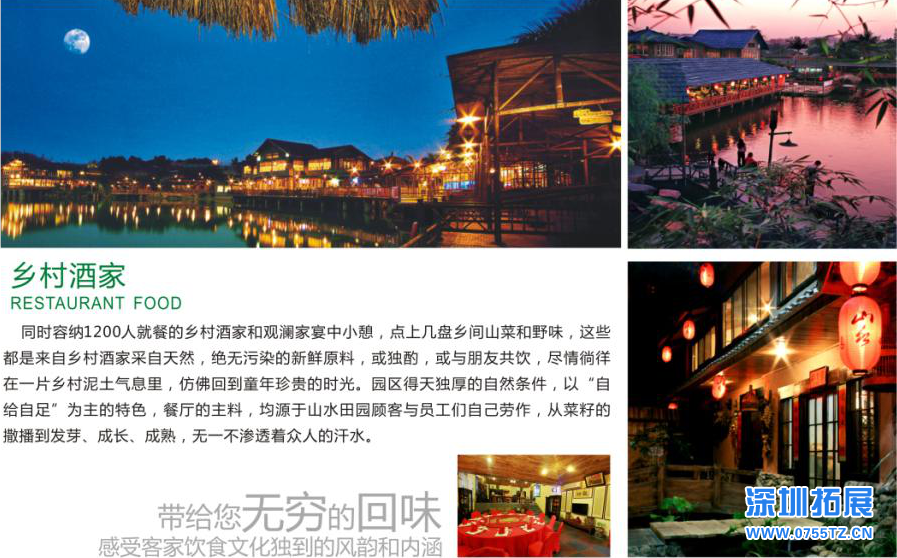 山水田园旅游文化园占地30万平方米,位于深圳市龙华区,依山傍水,浑然天成,是一个岭南客家水乡风情、生态田园情趣、民俗文化、国画产业为特色的国家AAAA级旅游景区。集美食、住房、温泉、游乐、演艺、拓展为一体,园区内山水度假村、乡村温泉、爱心动物园、生态农耕园、水上乐园、开心机动游乐园、儿童乐园、国画创作园相映成趣。